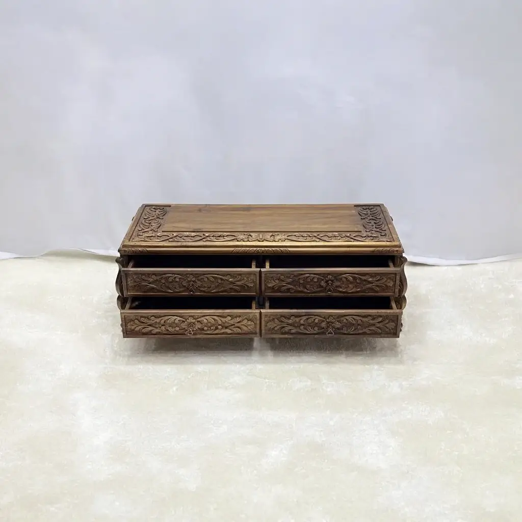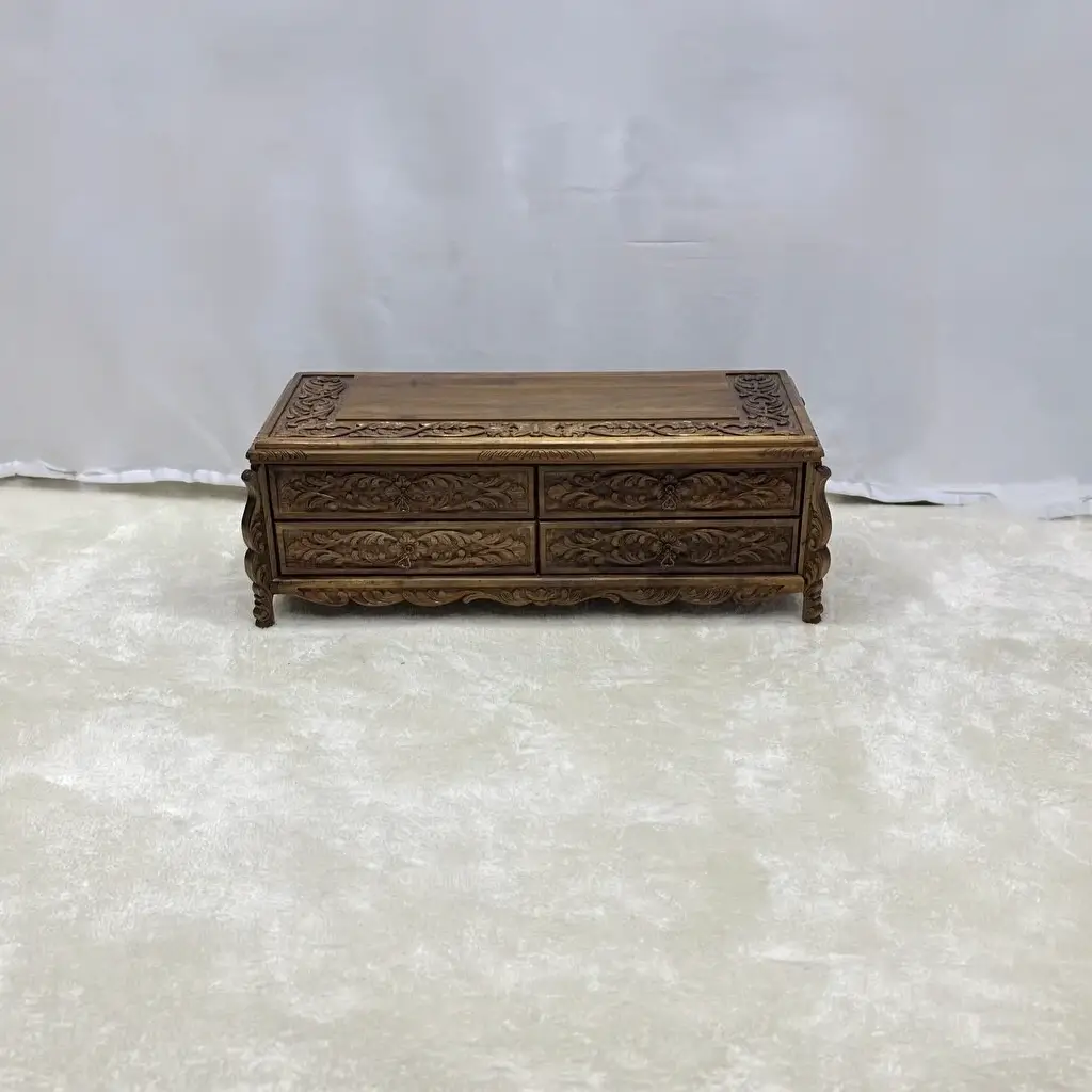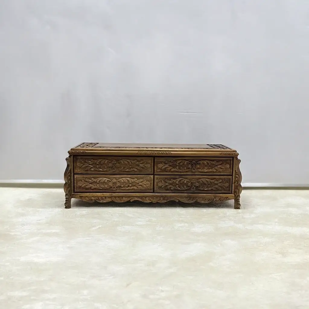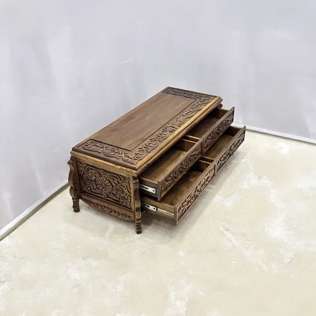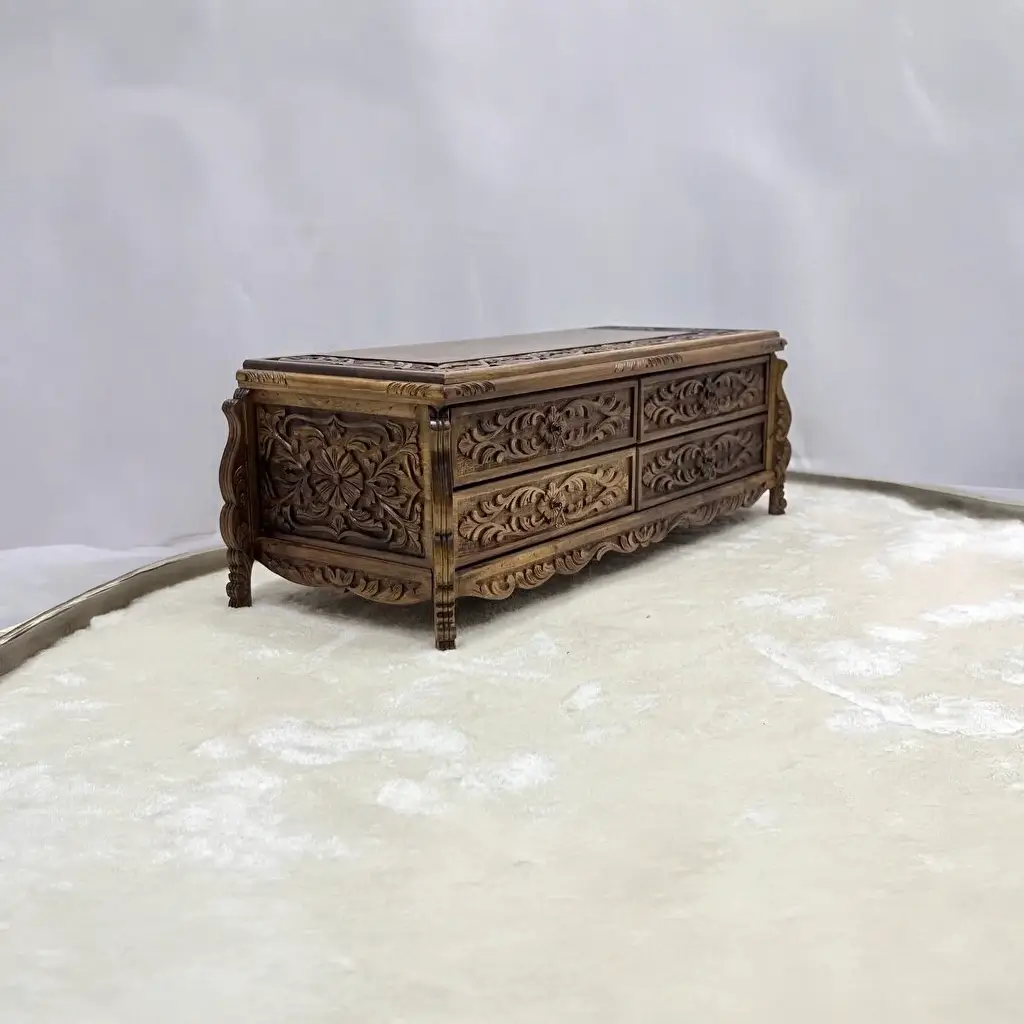 %100 doğal fırınlanmış ceviz ağacından üretilen el oyma TV ünitesi, 4 çekmeceli geniş depolama alanı ve sanatsal motifleriyle öne çıkar. Klasik ve rustik dekorasyonlara uyum sağlayan, çok amaçlı ve uzun ömürlü şık bir medya sehpasıdır.