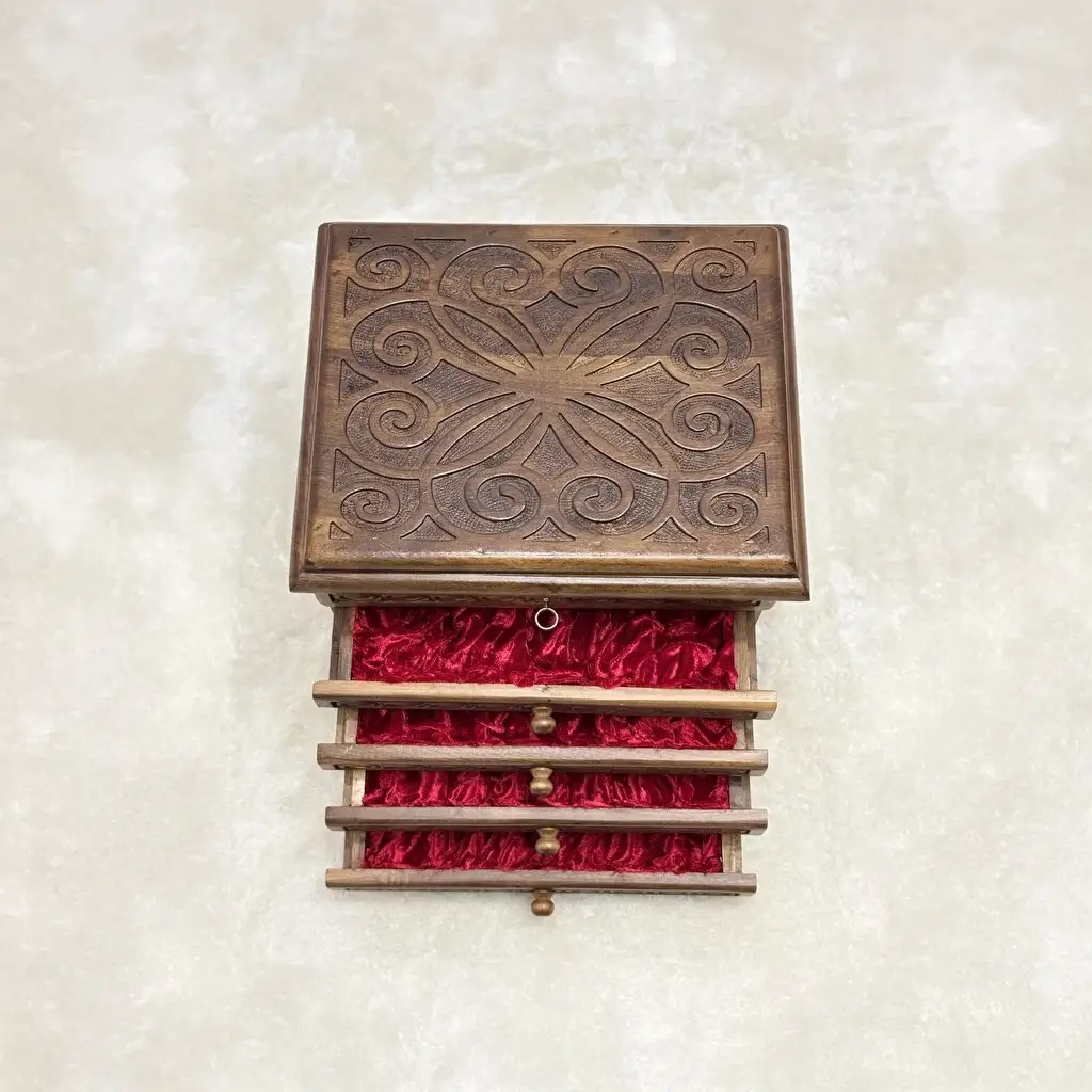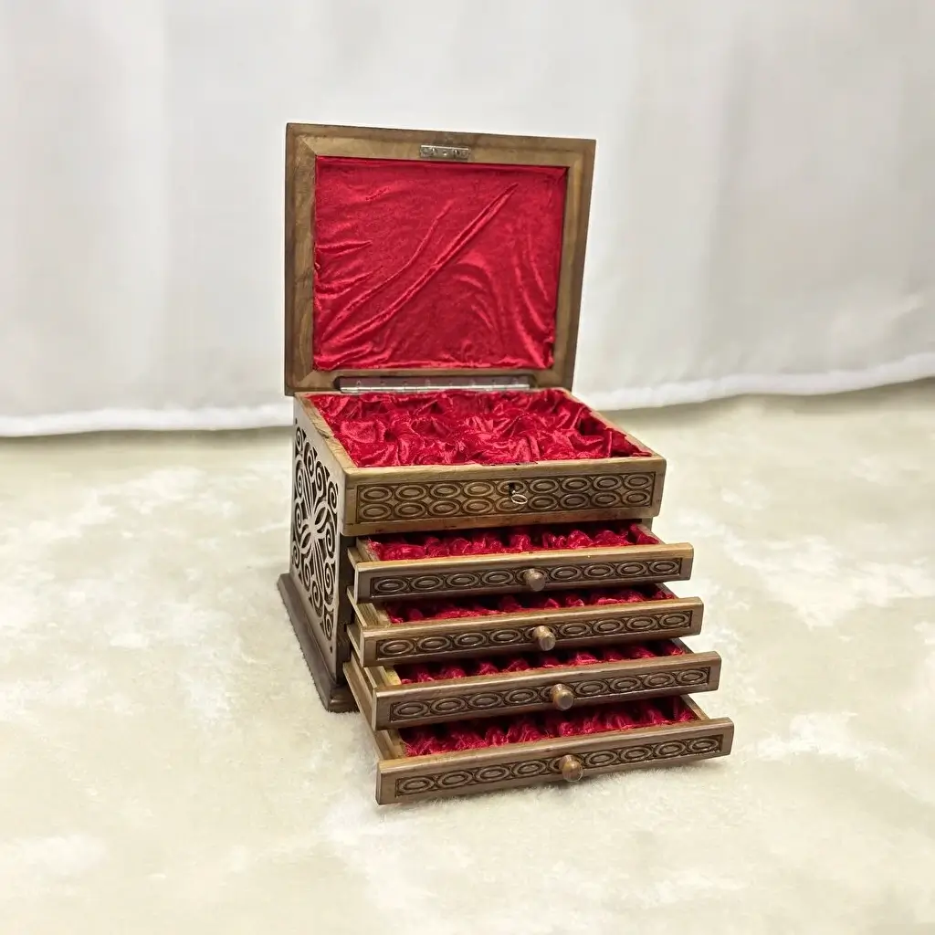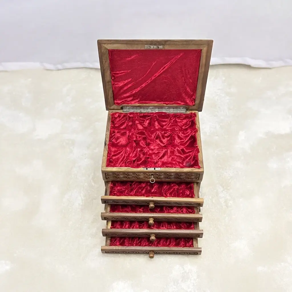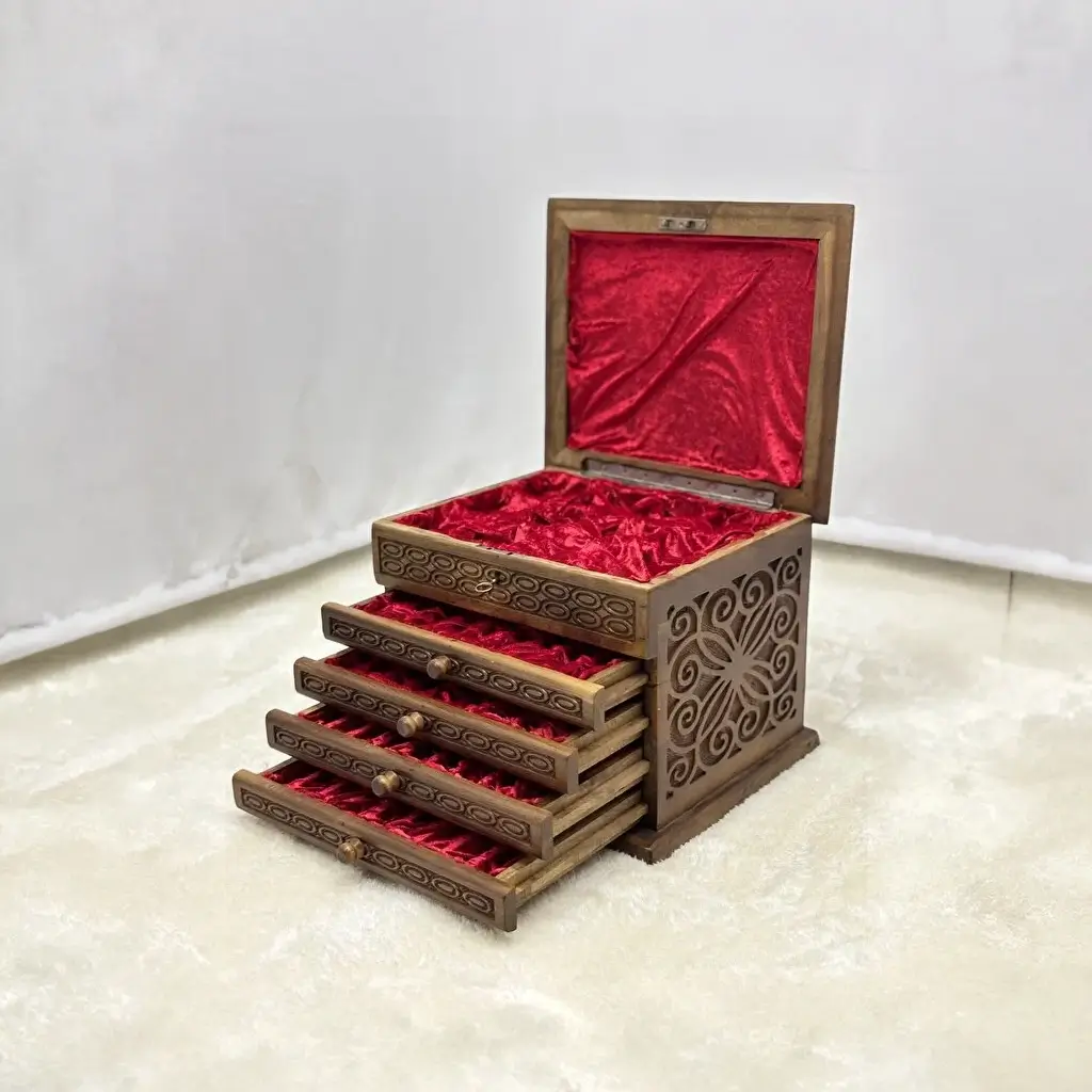El Oyma Ceviz Ahşap Saatlik ve 4 Çekmeceli Tespih Kutusu – Kadife Koleksiyon Kutusu 30x36x30 cm