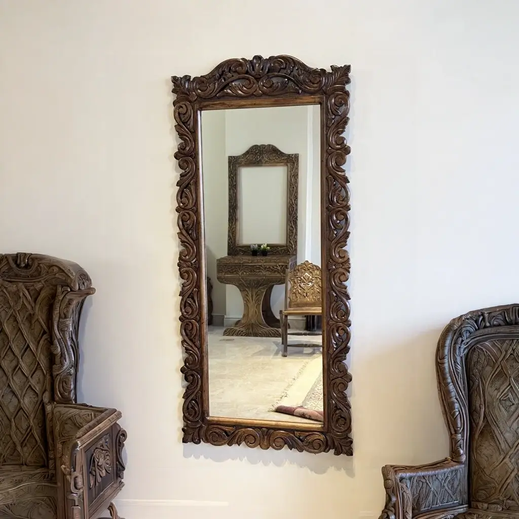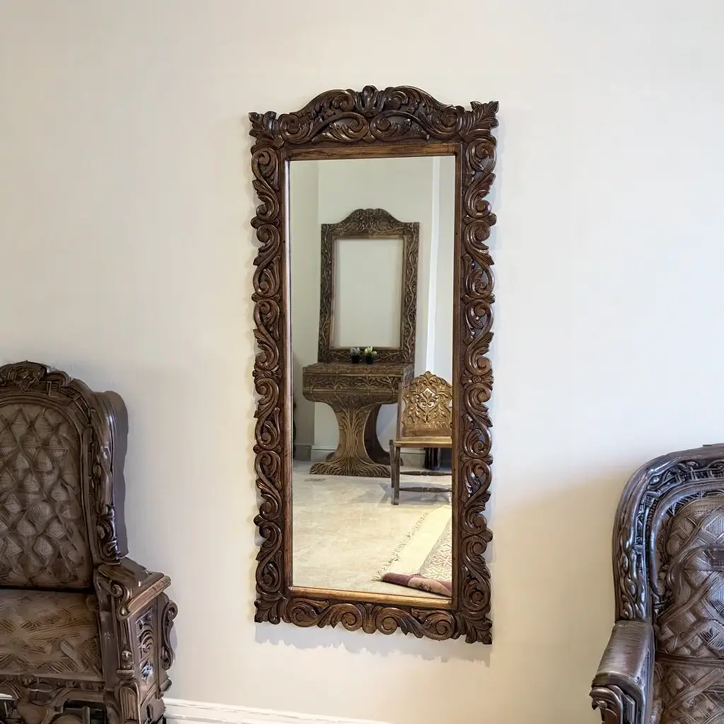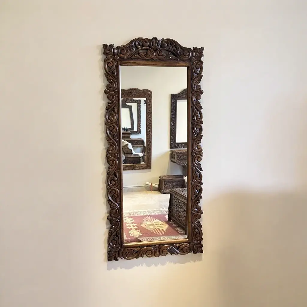 Maraş El Oyma Büyük Boy Ayna – 162×73,5 cm Ceviz Ahşap Duvar Aynası | Klasik Kıvrımlı Model