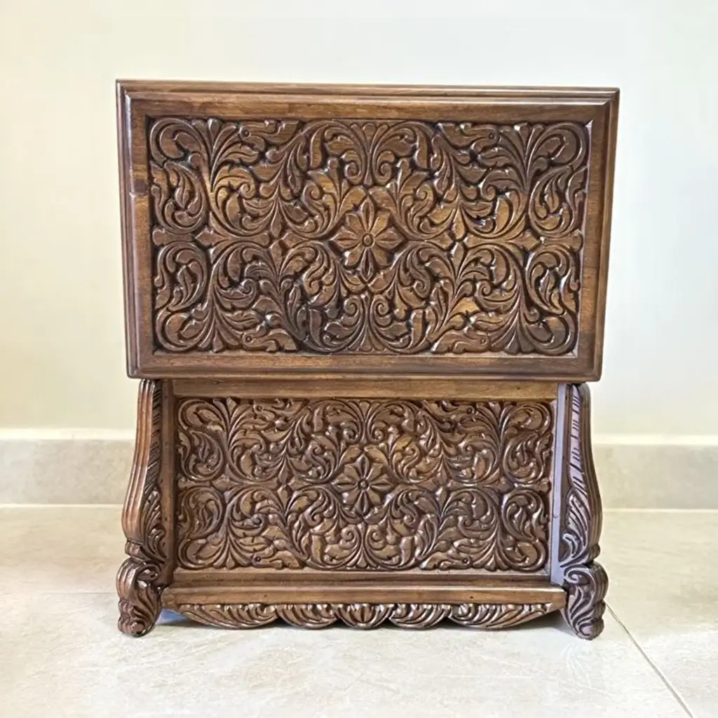 Maraş ustalarının el işçiliğiyle üretilen Erva Natural çeyiz sandığı, %100 doğal fırınlanmış ceviz ağacından yapılmıştır. 50x30x30 cm kompakt ölçüleriyle dekoratif ve işlevsel kullanım sunar. El oyma desenleriyle zamansız bir şıklık kazandırır.