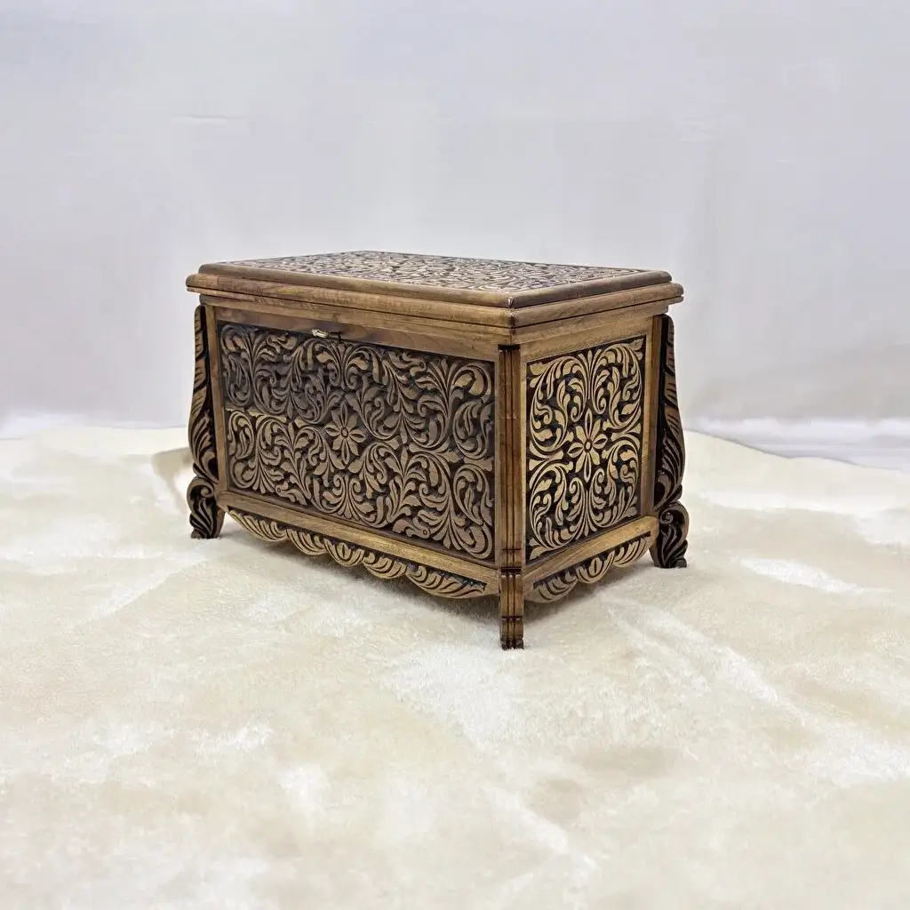 Maraş El Oyma Ceviz Ahşap Çeyiz Sandığı – 68x40x48 cm Orta Boy Sandık | Erva Eskitme Model